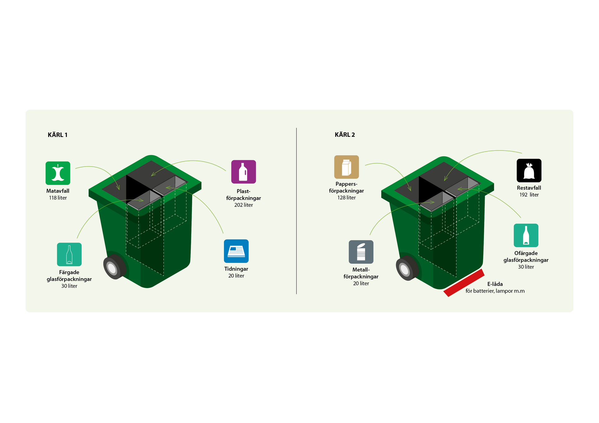 Med två fyrfackskärl får du en egen återvinningsstation utanför din dörr. Här kan du sortera det mesta avfall som du får i ditt hushåll.