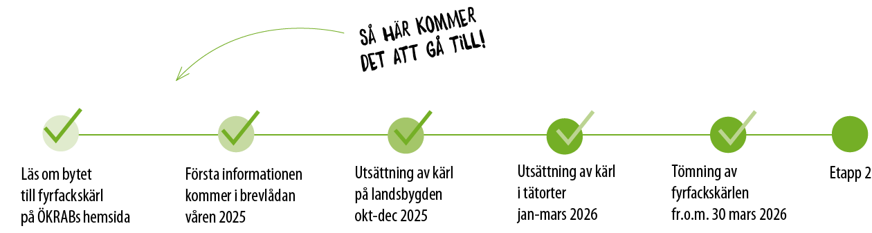 Ungefär 30.000 fyrfackskärl har satts ut på fastigheter över Simrishamns och Tomelilla kommuner. Under oktober - december 2025 sattes kärl först ut till de som tidigare hade ett kärl delat i två fack (landsbygd) och därefter skedde utsättning till de som hade två separata kärl för mat- och restavfall (mestadels tätorter). Samtliga fastighetsägare fick ett aviseringskort med information om fyrfackskärlen och utsättningen via post eller mejl i god tid före utsättning skedde. Framöver kommer utsättning av fyrfackskärl fortsätta hos enskilda fastigheter allt eftersom inventering fortskrider. Läs mer om utsättningen HÄR
