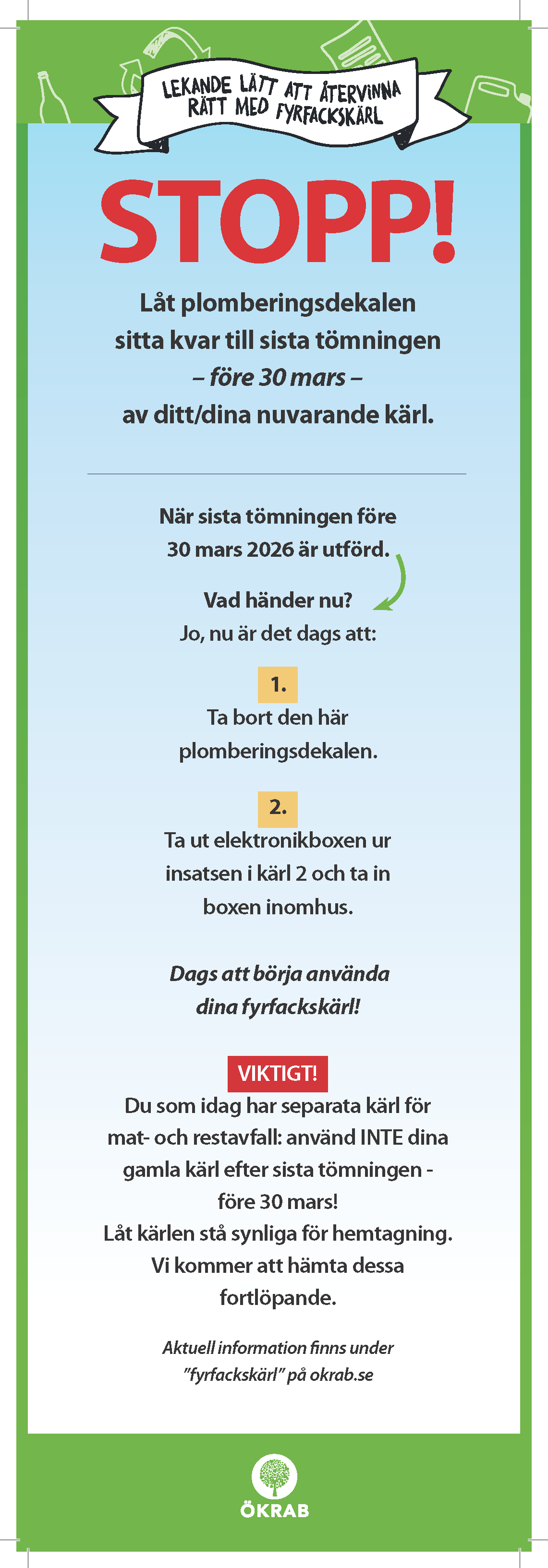 Införandet av fyrfackskärlen är ett omfattande projekt då cirka 30.000 nya kärl ska vara på plats innan tömningen startar från och med 30 mars 2026. Därför påbörjas utsättningen av plomberade kärl 1 oktober 2025 - för dig som idag har ett kärl som är delat i två fack för mat- och restavfall – och efter årsskiftet 2025/-26 för dig som idag har två separata kärl för mat- och restavfall. Utsättningen ser olika ut för de som idag har ett kärl och de som idag har två kärl. Utförlig information finns längre ner på sidan.