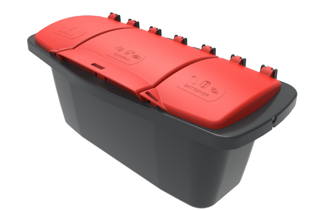 Tillbehör: I ett av de mindre facken i kärl 2 finns en elektronikbox. När du tagit bort plomberingstejpen efter sista tömningen – före 30 mars 2026 – så är det viktigt att du tar ut elektronikboxen ur kärlet och förvarar boxen inomhus. Fyll elektronikboxen med ljuskällor, batterier och små-elektronik i anvisade fack. Häng ut elektronikboxen på kärl 2 vid behov av tömning och ta därefter in boxen igen.